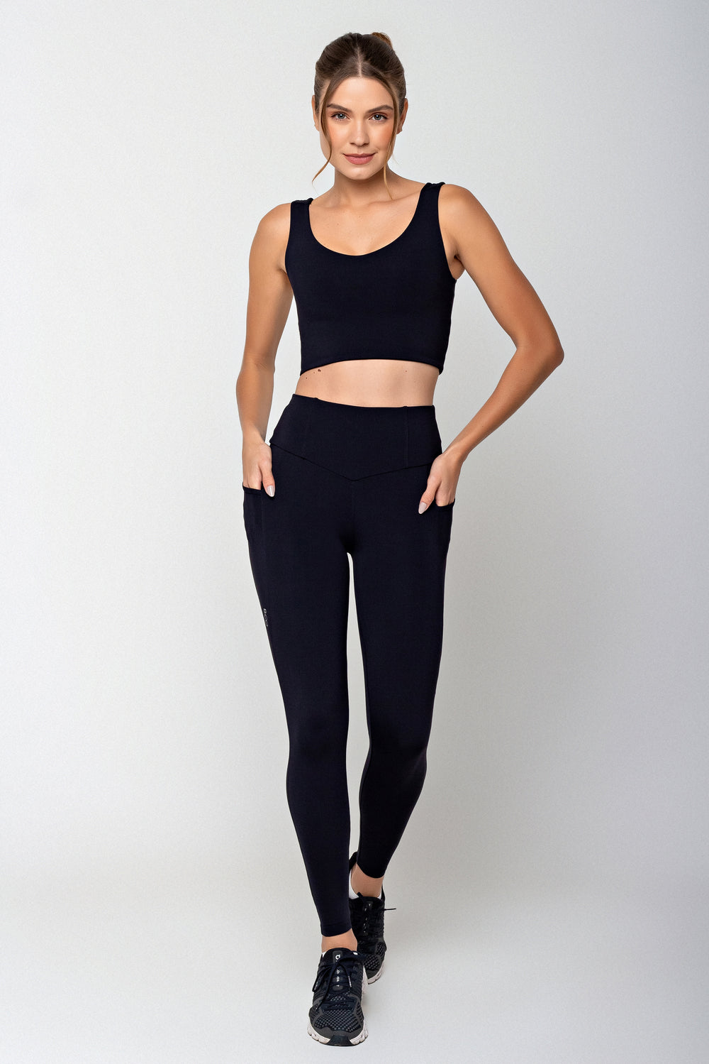 Confeccionada em tecido Naka, ela possui acabamento fosco e toque macio, proporcionando uma sensação premium ao vestir. A cintura alta e o cós largo moldam o corpo com segurança e leve compressão, garantindo estabilidade até nos movimentos mais intensos, enquanto criam uma estética refinada e alongada.