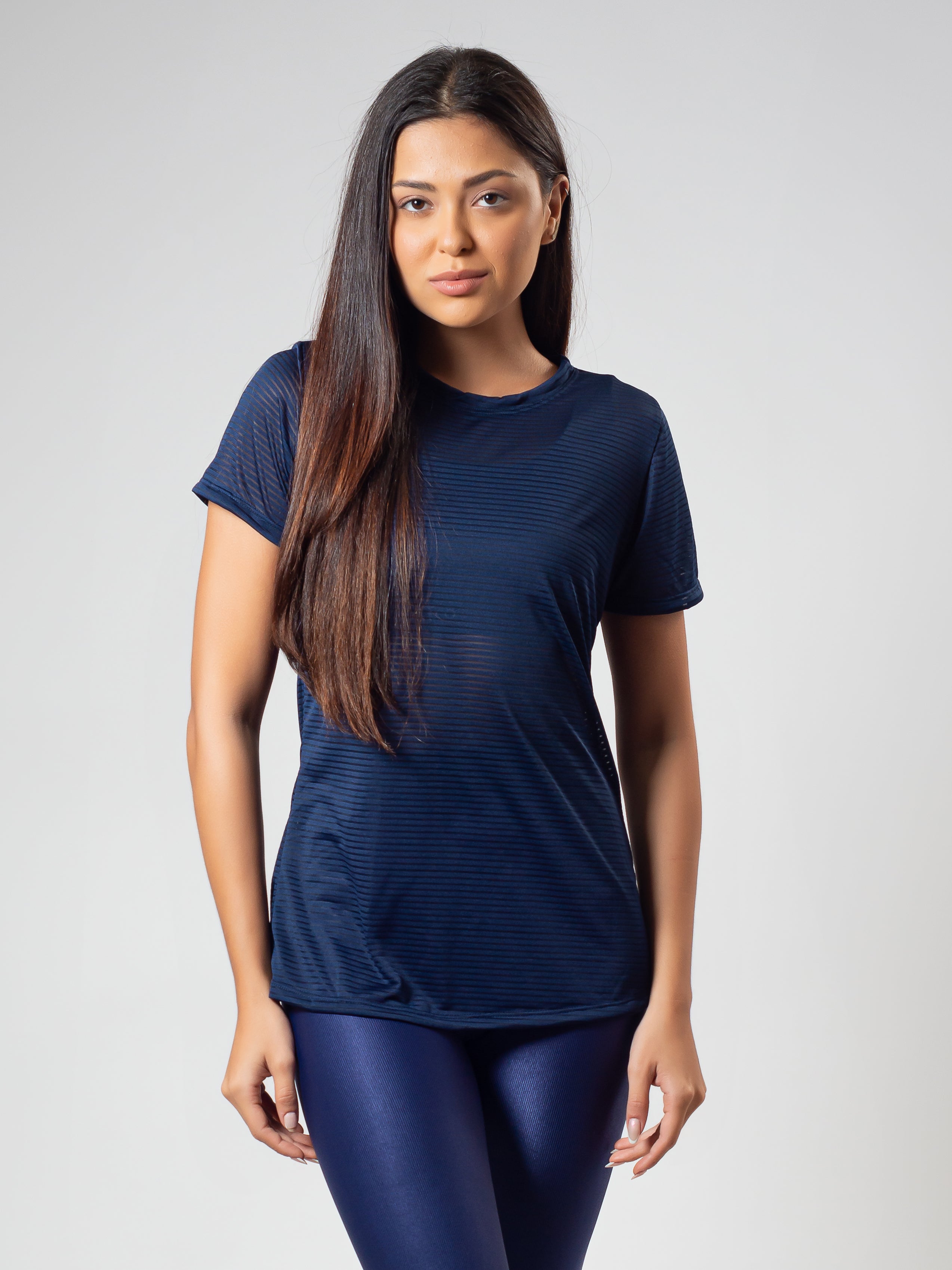 Camisa Meia Lua - Desenvolvido para ser uma peça que circula do casual ao treino ela foi confeccionado em tecido tecnológico de poliéster, tecido perfeito para o uso contínuo com toque macio e confortável de rápida secagem e resistente a diversos produtos; Possui decote U, com manga curta e tecido listrado com leve transparência e recorte em meia lua nas costas.