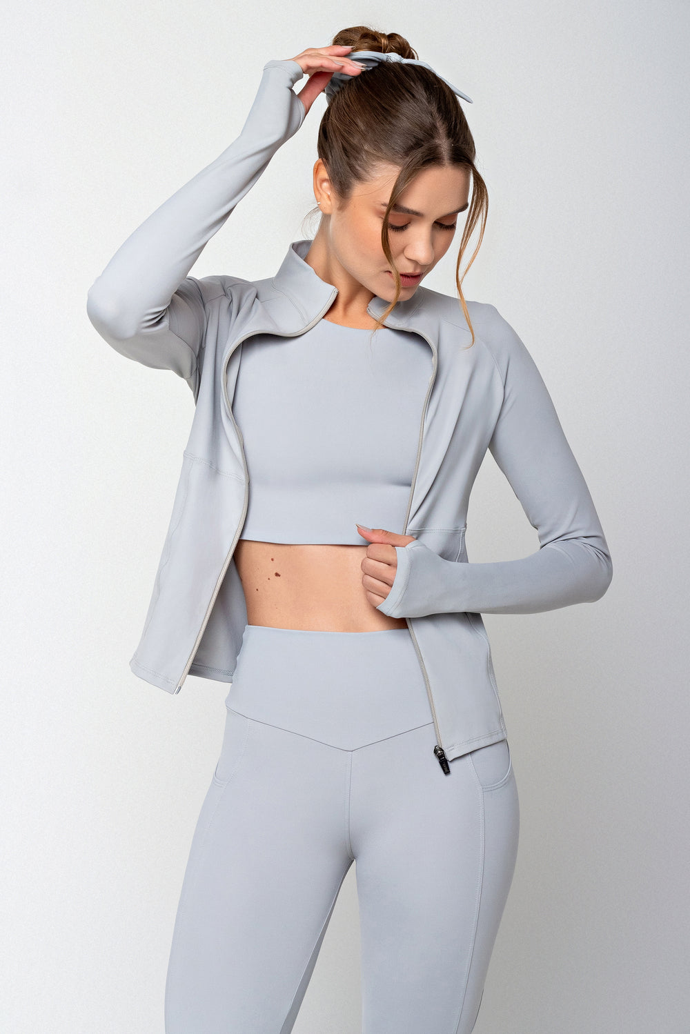 Os recortes estratégicos valorizam naturalmente a silhueta, enquanto o espaço para polegar na barra e a gola alta adicionam funcionalidade e proteção. O zíper com trava oferece segurança e praticidade, completando um design pensado nos mínimos detalhes.