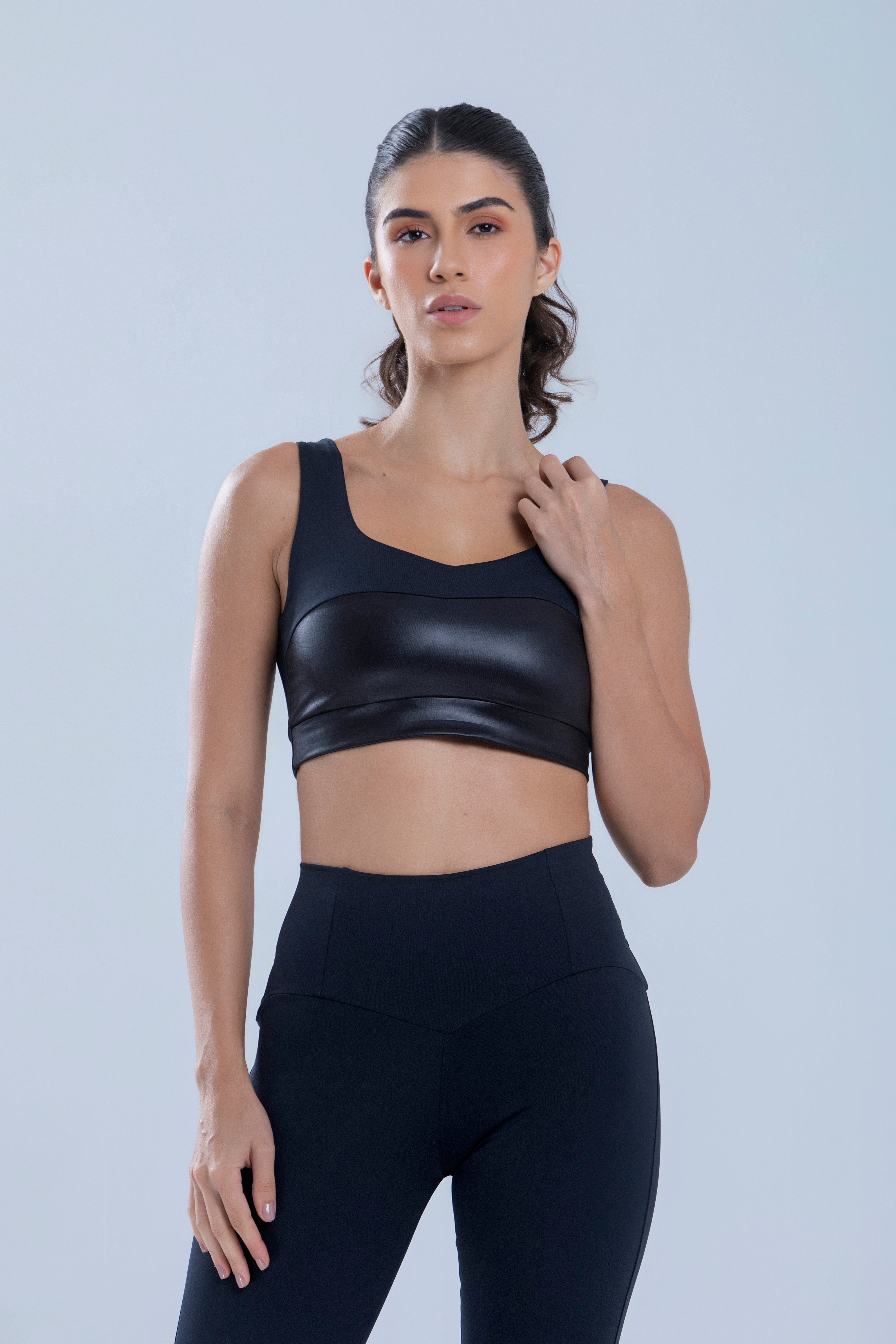 Combinando o melhor dos dois mundos, este modelo é confeccionado no mix de tecidos Clever e Cirrê, unindo o visual fosco à leveza de um brilho sutil — perfeito para quem ama peças que transitam entre o esportivo e o fashion. Seu design valoriza o busto com harmonia, graças ao decote desenhado com cuidado e ao elástico posicionado logo abaixo, garantindo sustentação sem abrir mão do conforto.